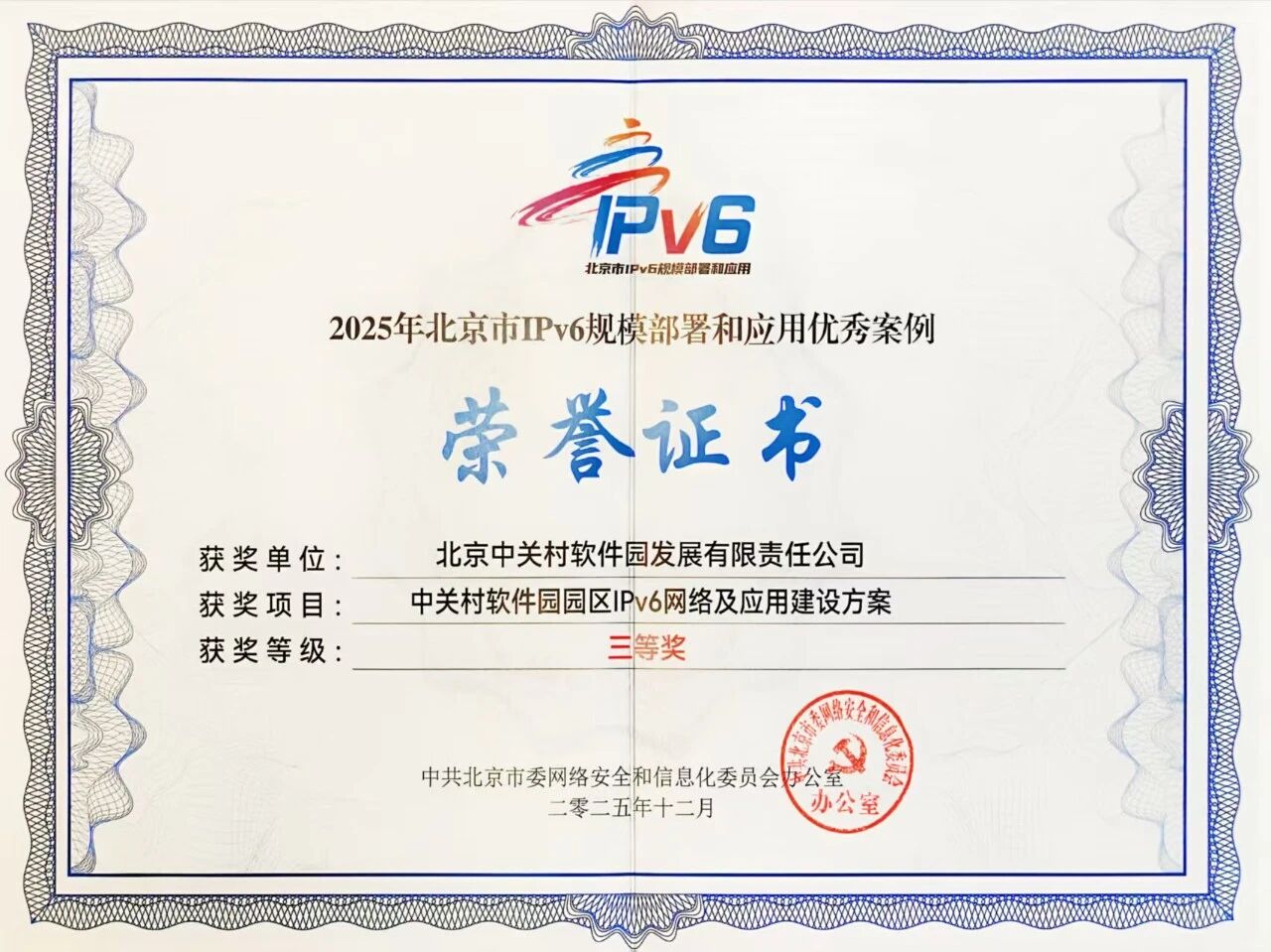 中关村软件园IPv6建设方案荣获北京市优秀案例三等奖